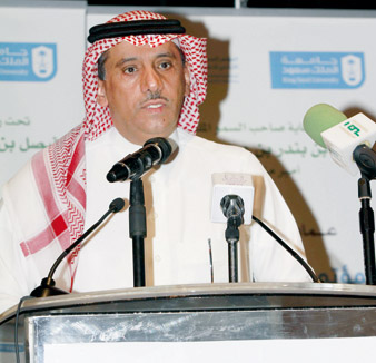 بعد ذلك ألقى معالي مدير جامعة الملك سعود الدكتور بدران بن عبدالرحمن العمر كلمة رحب فيها بالحضور منوهاً باهتمام الجامعة بالبحث العلمي، وقال: لا تزال جامعة الملك سعود ماضية بعزم وتصميم على طريق العناية بالبحث العلمي، دعماً ورعاية، وتشجيعاً وتمويلاً، حتى تساوت لديها موازين التركيز ما بين التعليم والبحث العلمي لتلتقي بهذا الاهتمام مع المعايير المعمول بها في كبرى الجامعات العالمية الرائدة، حتى أنها أعدت للبحث العلمي خطة استراتيجية ترتبط مع مسار خطط التنمية الشاملة التي تنفذها حكومة خادم الحرمين الشريفين -يحفظه الله- للرقي بالوطن والمواطن. واستناداً على هذه الخطة فإن الجامعة لم تحصر عملها على تحقيق غزارة البحث والنشر العلمي فحسب، بل إنها تشترط في كل إنتاجها البحث أن يكون عالي الجودة، يتوافق مع المعايير المعمول بها في أرقى الأكاديميات والجامعات العالمية.