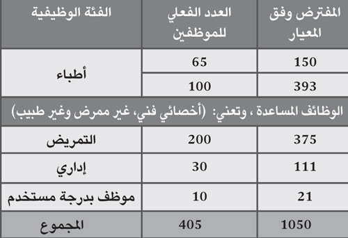 وهنا جدول يوضح القوى العاملة المفترضة بحسب معايير وزارة الصحة، والعدد الفعلي للموظفين في مستشفى وادي الدواسر :