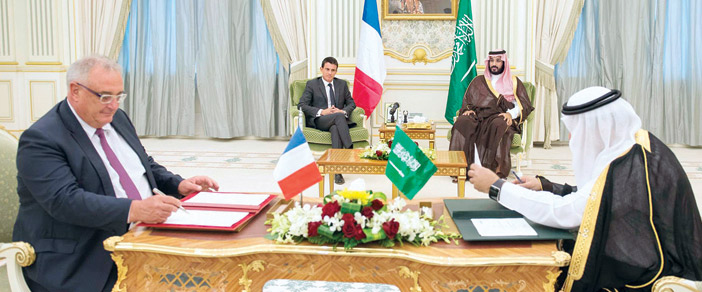 جرى أمس بحضور صاحب السمو الملكي الأمير محمد بن سلمان بن عبدالعزيز ولي ولي العهد النائب الثاني لرئيس مجلس الوزراء وزير الدفاع رئيس مجلس الشئون الاقتصادية والتنمية، المشرف على اللجنة التنسيقية السعودية الفرنسية المشتركة، ودولة رئيس وزراء جمهورية فرنسا ايمانويل فالس، في قصر اليمامة بالرياض، التوقيع على أربع اتفاقيات وخطاب نوايا بين المملكة وجمهورية فرنسا. فقد تم توقيع اتفاقية تعاون بين مدينة الملك عبدالعزيز للعلوم والتقنية، ومديرية الإنشاء البحري والأنظمة الفرنسية لإقامة مركز أبحاث بحرية، وقعها من الجانب السعودي صاحب السمو الأمير الدكتور تركي بن سعود بن محمد رئيس المدينة، ومن الجانب الفرنسي رئيس المديرية هرفي غييو.