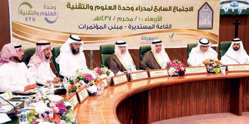 وأكد سموه في كلمته التي ألقاها أمس الأول خلال حضوره الاجتماع السابع لمدراء وحدات العلوم والتقنية الذي عقد في رحاب جامعة الإمام محمد بن سعود الإسلامية بالرياض، على تواصل لقاءات مدراء وحدات العلوم والتقنية منوها أن الهدف منها أن يكون العمل جماعياً من أجل التخطيط والعمل سوياً للرقي بهذا البلد ليكون في مصاف الدول المتقدمة بقيادة خادم الحرمين الشريفين الملك سلمان بن عبدالعزيز آل سعود وسمو ولي العهد صاحب السمو الملكي الأمير محمد بن نايف بن عبدالعزيز آل سعود وسمو ولي ولي عهده صاحب السمو الملكي الأمير محمد بن سلمان بن عبدالعزيز - حفظهم الله - ، حيث تجد العلوم والتقنية والبحث العلمي الدعم اللا محدود من الدولة.