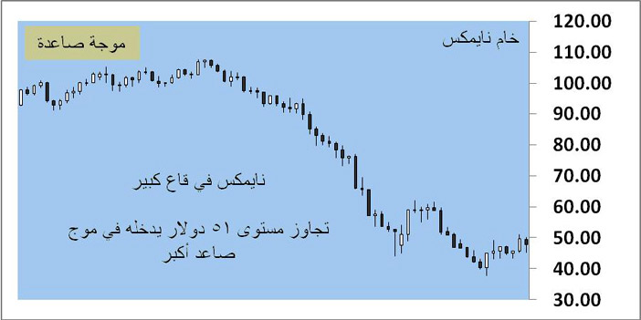 افتتح خام نايمكس أسبوعه على هبوط إلى مستوى 45 دولارًا وتقليص للخسائر مع نهاية الأسبوع إلى مستوى 47.7 دولار وانتهى الأسبوع بنمط بيعي ضعيف لكن الاتجاه لا يزال صاعدًا على مستوى الحركة الأسبوعية بسبب ضعف العملة الخضراء وتداولها دون مستوى 95 أمام سلة عملاتها، وسلوك الدولار بهبوطه دون هذا المستوى رفع من تكلفة شراء برميل النفط خصوصًا مع الأداء الإيجابي للمؤشرات الاقتصادية في الصين.
