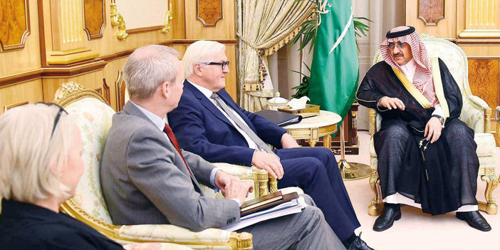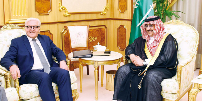 استقبل صاحب السمو الملكي الأمير محمد بن نايف بن عبدالعزيز ولي العهد نائب رئيس مجلس الوزراء وزير الداخلية - حفظه الله - في قصر اليمامة أمس معالي وزير الخارجية الألماني الدكتور فرانك فالتو شتاينماير. وجرى خلال الاستقبال بحث أوجه التعاون القائم بين البلدين الصديقين وسبل تعزيزها في مختلف المجالات، إلى جانب بحث تطورات الأوضاع على الساحتين الإقليمية والدولية. حضر الاستقبال معالي وزير الخارجية الأستاذ عادل بن أحمد الجبير، ومعالي رئيس الاستخبارات العامة الأستاذ خالد بن علي الحميدان. فيما حضره من الجانب الألماني سفير ألمانيا لدى المملكة بوريس روغه ، ومدير عام الشئون الاقتصادية والتنمية المستدامة ديتر فالتر هالر ومدير عام الشئون السياسة لأفريقيا وآسيا وأمريكا اللاتينية والشرق الأوسط سابينا شبار فاسر.