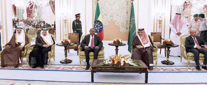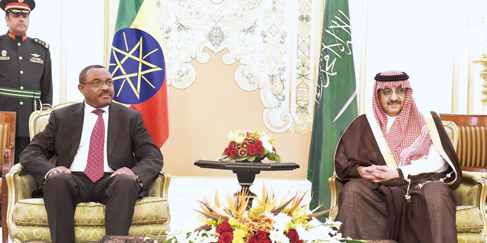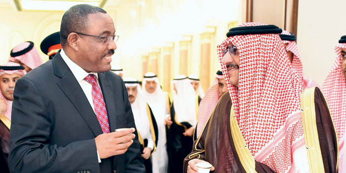 وكان دولة رئيس وزراء جمهورية إثيوبيا هايلي ماريام دسالني قد وصل مساء أمس إلى الرياض، في زيارة رسمية للمملكة. وكان في مقدمة مستقبليه بمطار قاعدة الملك سلمان الجوية صاحب السمو الملكي الأمير محمد بن نايف بن عبدالعزيز ولي العهد نائب رئيس مجلس الوزراء وزير الداخلية - حفظه الله -. كما كان في استقبال دولته، معالي وزير الدولة عضو مجلس الوزراء الدكتور عصام بن سعد بن سعيد الوزير المرافق، ومعالي أمين منطقة الرياض المهندس ابراهيم بن محمد السلطان، ووكيل رئيس المراسم الملكية الأستاذ هشام بن حسن آل الشيخ، والقائم بالأعمال بالنيابة بسفارة خادم الحرمين الشريفين لدى جمهورية إثيوبيا خالد بن مبروك الخالد، والقائم بأعمال سفارة جمهورية إثيوبيا لدى الرياض تمسغن عمر. وقد أجريت لدولة رئيس وزراء إثيوبيا، مراسم استقبال رسمية، حيث عزف السلامان الوطنيان للبلدين، ثم استعرض حرس الشرف. بعد ذلك صافح دولة رئيس وزراء إثيوبيا مستقبليه، صاحب السمو الملكي الأمير الدكتور منصور بن متعب بن عبدالعزيز وزير الدولة عضو مجلس الوزراء مستشار خادم الحرمين الشريفين، وصاحب السمو الملكي الأمير متعب بن عبدالله بن عبدالعزيز وزير الحرس الوطني، وصاحب السمو الملكي الأمير الدكتور عبدالعزيز بن سطام بن عبدالعزيز مستشار خادم الحرمين الشريفين، وصاحب السمو الملكي الأمير منصور بن مقرن بن عبدالعزيز المستشار بالديوان الملكي، ومعالي رئيس مجلس الشورى، وأصحاب المعالي الوزراء وكبار المسؤولين من مدنيين وعسكريين، وأعضاء سفارة إثيوبيا بالرياض. كما صافح سمو ولي العهد - أيده الله - أعضاء الوفد الرسمي المرافق لدولة رئيس وزراء إثيوبيا الذي يضم معالي وزير الدفاع سراج فقيسا، ومعالي وزير المالية والتنمية الاقتصادية عبدالعزيز محمد، ومعالي وزير الإعلام قيتاشو ريدا ، ومعالي مدير جهاز الأمن والاستخبارات الوطني جيتاشو اسفا، ومعالي رئيس أركان حرب القوات المسلحة الجنرال سامورا يونس ، ومعالي المستشار الاقتصادي الخاص لدولة رئيس الوزراء وزير المالية والتنمية الاقتصادية الأسبق سفيان أحمد، ووزير الدولة في وزارة الخارجية السفير تايي اتسكيسيلاسي، والمدير في جهاز الاستخبارات والأمن الوطني هادرا ابيرا ادماسو، ومعالي وزير الدولة بمكتب رئيس الوزراء سورافيل مهرتاب ابيد، ومدير العام بإدارة الشرق الأوسط بوزارة الخارجية السفير سراج رشيد، ومدير عام بإدارة الشرق الوسط بوزارة الخارجية زلالم برهان. وبعد استراحة قصيرة في صالة التشريفات اصطحب سمو ولي العهد دولة رئيس وزراء جمهورية إثيوبيا في موكب رسمي إلى قصر الملك سعود للضيافة.