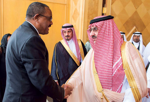 عقد صاحب السمو الملكي الأمير محمد بن نايف بن عبدالعزيز ولي العهد نائب رئيس مجلس الوزراء وزير الداخلية - حفظه الله - في قصر اليمامة أمس اجتماعاً مع دولة رئيس وزراء جمهورية إثيوبيا هايلي ماريام دسالني. وجرى خلال الاجتماع استعراض العلاقات الثنائية بين البلدين ، وسبل دعمها وتعزيزها في مختلف المجالات ومنها ما يتعلق بالتعاون الاقتصادي والاستثماري خاصة في المجال الزراعي وكذلك تعزيز التبادل التجاري بين البلدين، بالإضافة إلى بحث مستجدات الأحداث في المنطقة. حضر الاجتماع وزير المالية الدكتور إبراهيم بن عبدالعزيز العساف، ووزير التجارة والصناعة الدكتور توفيق بن فوزان الربيعة ، ووزير الدولة عضو مجلس الوزراء الدكتور عصام بن سعد بن سعيد الوزير المرافق، و وزير الزراعة الأستاذ عبدالرحمن بن عبدالمحسن الفضلي، ووزير الدولة للشؤون الخارجية الدكتور نزار عبيد مدني، ومحافظ مؤسسة النقد العربي السعودي الدكتور فهد بن عبدالله المبارك ، ومحافظ الهيئة العامة للاستثمار المهندس عبداللطيف بن أحمد العثمان، والقائم بالأعمال بالنيابة بسفارة خادم الحرمين الشريفين لدى جمهورية أثيوبيا خالد بن مبروك الخالد.