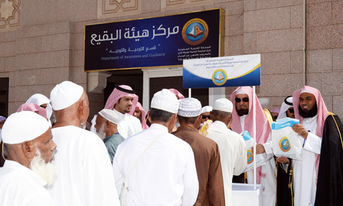 وشارك معاليه الأعضاء توزيع المواد التوجيهية على الزوار، واطلع على التجهيزات المعدّة لاستقبال ضيوف الرحمن بعد أن أدوا مناسك حج هذا العام بكل يسر وسهولة، كما افتتح المعرض التوجيهي بالبقيع.