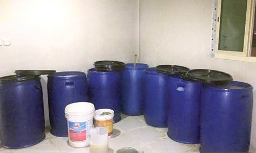 وفي التفاصيل تلقى مركز العمليات الأمني بلاغاً من أحد المواطنين عصر يوم الجمعة الموافق 1436/12/26هـ مفاده وجود أشخاص داخل إحدى الشقق بحي الفيحاء يمارسون أنشطة مشبوهة قد يكون لها علاقة بتصنيع الخمور نظراً لانبعاث رائحة كريهة من الموقع، فور تلقي البلاغ تم تكثيف التواجد الأمني بالحي وإغلاق كافة المنافذ، وبمداهمة الشقة تم ضبط امرأة سيرلانكية الجنسية تبين أنها حولت الشقة إلى معمل متكامل لتصنيع الخمور، وبتفتيش الموقع عثر على سبعة براميل كبيرة مملوءة بمادة العرق المسكر وعثر أيضا على خمسين قارورة من الحجم الكبير جاهزة للبيع وكذلك وجد في شنطة المرأة مبالغ مالية وبعض المجوهرات. جرى اتخاذ الإجراءات اللازمة والتحفظ على المرأة والمضبوطات وسلمت القضية لمركز شرطة المنار لاستكمال التحقيق.