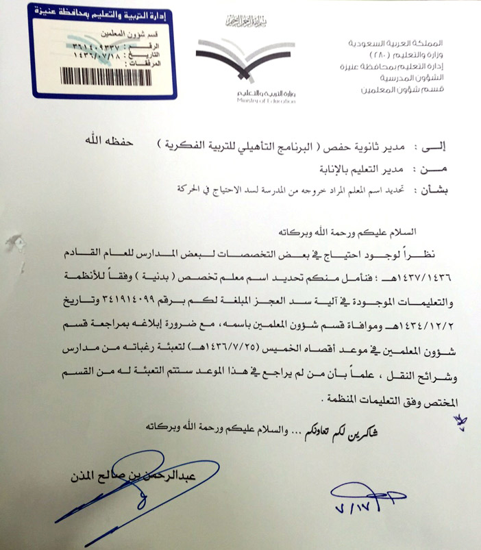 2 - قبل بداية العام الدراسي كتب رئيس شعبة التربية البدنية الأستاذ خالد الوهيبي خطاباً لرئيس الإشراف الأستاذ أحمد العبيسي (مرفق صورة)، يوضح فيه أن هناك عجزاً بواقع (10) معلمين في حين أنه يتوفر (10) معلمين مفرغين لأعمال إشرافية في الإدارة، ويأمل الوهيبي أن يسد العجز من هذا العدد المتوفر مراعاة لمصلحة الطلاب، ولكن لم يتم الموافقة على سد العجز مراعاة للمشرفين التربويين الذين يمارسون أعمالا إدارية.