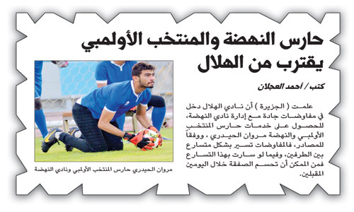 وقع نادي الهلال رسمياً مع حارس المنتخب الأولمبي ونادي النهضة مروان الحيدري ( 20 عاما) وذلك مساء أمس في محافظة المجمعة حيث لعب النهضة أمام الفيحاء.