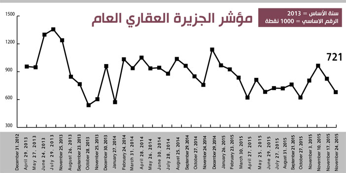 انخفض مؤشر الجزيرة العقاري الأسبوع الماضي 10.3 بالمائة ليغلق عند مستوى 721 نقطة، مقارنة بإغلاق 803 نقطة للأسبوع قبل الماضي وسجل القطاعان السكني والتجاري انخفاضاً ومن الملاحظ أن جميع مكونات المؤشر تراجعت جاء أكبرها في المرافق والشقق بنحو 50 % و37 % على التوالي، فيما سجل قطاع الأراضي والذي يشكل الوزن الأكبر في المؤشر تراجع بنسبة 7 % فقط، وبهذا الإغلاق تراجع مؤشر الجزيرة إلى أدنى مستوى له منذ 13 أبريل 2015 وبذلك اصبح أثر قرار فرض الرسوم على الأراضي البيضاء واضح على السوق العقاري، حيث نلاحظ تراجع مستمر للمؤشر منذ الاعلان عن إحالته لمجلس الشورى، وبلغت قيمة متوسط المؤشر لآخر ثلاثة المؤشر 833 نقطة حيث ابتعد المؤشر كثيراً عن متوسطة.