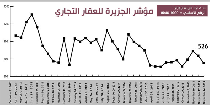 انخفض مؤشر الجزيرة للعقار التجاري الأسبوع الماضي بنسبة 9.6 بالمائة ليغلق عند مستوى 526 نقطة، مقارنة بإغلاق 581 نقطة للأسبوع قبل الماضي، وبالنظر إلى مكونات المؤشر فقد سجلت جميعا باستثناء الأراضي الزراعية الداخلة تحت القطاع التجاري. وجاءت أكبر نسبة انخفاض بالنشاط في العمائر والمعارض بنسبة 60 % و50 % على التوالي، فيما سجل نشاط الشقق تراجعاً بنسبة 42 %، وبلغ متوسط قيمة المؤشر لآخر ثلاثة أشهر 594 نقطة. وبالنظر إلى أداء المؤشر التجاري منذ بداية هذا العام 2015 فقد انخفض بنسبة 29.4 بالمائة، فيما بلغت نسبة الانخفاض في المؤشر التجاري من بداية التأسيس 47.4 بالمائة.