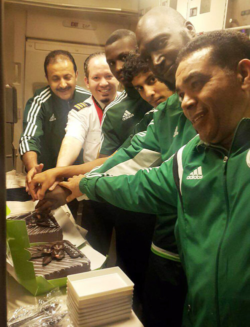 تفاجأت بعثة المنتخب السعودي خلال رحلة العودة على الخطوط السعودية من جاكرتا إلى الرياض بقيام الناقل الخطوط السعودية بعمل احتفالية بهذه المناسبة بعد ان قام مدير المحطة الاستاذ عبد المحسن العمير باستقبال البعثة في المطار وإدخالهم لصالة ركاب الدرجة الأولى والاحتفاء بهم، وبعد صعود الطائرة هنأ قائد الطائرة طلال العتيبي البعثة بهذا الإنجاز وسط تصفيق ومباركة الركاب وتم إركاب عدد من اللاعبين والمدربين في الدرجة الأولى حسب المقاعد المتاحة، وتم خلال الرحلة رقم 813 إقامة حفل شاي وتقطيع عدد من تورت بهذه المناسبة، حيث تعتبر هذه المبادرة جميلة من قبل الخطوط السعودية حيث قدمت البعثة شكرها للأستاذ عبد المحسن العمير ومروان التومه وطلال العتيبي.