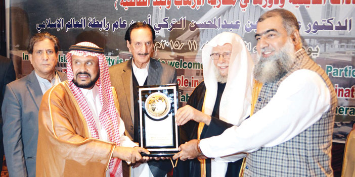 قال معالي الأمين العام لرابطة العالم الإسلامي الدكتور عبدالله بن عبدالمحسن التركي إن المملكة العربية السعودية بقيادة خادم الحرمين الشريفين الملك سلمان بن عبدالعزيز آل سعود ـ حفظه الله ـ، تحذر في مختلف المناسبات من آفة الإرهاب والطائفية على المجتمعات الإسلامية. وأكد الدكتور التركي في كلمته التي ألقاها خلال رعايته أمس الندوة العالمية التي نظمتها الجامعة الإسلامية العالمية في إسلام آباد بعنوان «القيادات الدينية ودورها في محاربة الإرهاب ونبذ الطائفية»، أهمية التركيز على محاربة الإرهاب ونبذ الطائفية والغلو، مشيراً إن هذه الندوة التي تعقد في جامعة إسلامية عالمية عليها أن تحرص كل الحرص على جمع كلمة المسلمين وتوحيد صفوفهم والدعوة إلى ارتباطهم بكتاب الله سبحانه وتعالى وسنة نبيه صلى الله عليه وسلم والابتعاد عن الحزبية والتعصب العرقي»، وأشار معالي الأمين العام لرابطة العالم الإسلامي إلى أن الرابطة تتواصل مع الشعوب الأخرى وأتباع الديانات والثقافات المختلفة من أجل التعريف بالإسلام وتصحيح صورته الحقيقية والتي شوهت للأسف من أعدائه، متأملا أن تكون النتائج مثمرة وتشهد مختلف الدول العربية والإسلامية الأمن والاستقرار والابتعاد عن الإرهاب والتطرف . من جانبه قدم معالي رئيس الحزب الحاكم عضو مجلس الشيوخ الباكستاني راجه ظفر الحق، شكره لمعالي الأمين العام لرابطة العالم الإسلامي على رعايته للندوة، مؤكداً أن باكستان تنظر دائماً إلى المملكة العربية السعودية باحترام وتؤيد الدور الريادي الذي تؤديه بقيادة خادم الحرمين الشريفين الملك سلمان بن عبدالعزيز آل سعود - حفظه الله - في خدمة الإسلام والمسلمين والوقوف مع الشعوب الإسلامية والدفاع عن القضايا الإسلامية والتصدي لظاهرة الإرهاب. وأفاد أن المملكة معروفة منذ البداية بانتهاج منهج الوسطية والاعتدال، وهو ما تحتاجه القيادات الدينية للاقتداء به في مواجهة التطرف ونبذ الطائفية. من جهته أكد معالي رئيس الجامعة الإسلامية العالمية الدكتور أحمد بن يوسف الدريويش، أهمية الدور الذي تؤديه الجامعة استشعاراً بمسؤولياتها في التصدي لفكر التيارات الإرهابية الجانحة اعتماداً على منهج الوسطية، والدعوة إلى ضرورة تضافر وتأصيل الجهود بين العلماء والقيادات الدينية لمكافحة الإرهاب. حضر الندوة أمير جمعية أهل الحديث المركزية عضو مجلس الشيوخ الباكستاني ساجد مير، ورئيس مجلس علماباكستان الشيخ طاهر محمود الأشرفي، والقائم بأعمال سفارة خادم الحرمين الشريفين لدى باكستان الوزير مفوض جاسم بن محمد الخالدي، وعدد من العلماء والمشايخ .