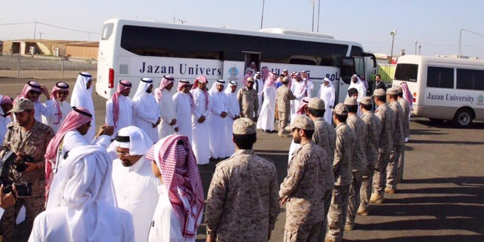 كان في استقبال الوفد قائد اللواء الثامن عشر ناصر الأحمري، وأركانات اللواء. وأوضح اللواء الأحمري، أن لهذه الزيارة الأثر الكبير في رفع معنويات الضباط والأفراد الذين يشاركون في ميدان الشرف والعز والكرامة، وأنها زيارة ترفع الرأس، وأن النصر قريب جداً - بمشيئة الله. مؤكداً أن حدودنا آمنة -ولله الحمد- وجنود الوطن مستعدون بكافة ما لديهم من إمكانات بشرية وعسكرية كبيرة للدفاع عن وطن المقدسات بأرواحهم ودمائهم من أجل إعلاء كلمة الله. فيما أكد عدد من الشباب بأنهم قد أتوا من مختلف مناطق المملكة؛ لتوصيل رسالة لكافة القوى الداخلية والخارجية بأن الشباب هم عماد الوطن وأنهم على أهبة الاستعداد للتضحية بكل ما لديهم متى ما احتاجهم الوطن. وقال سليمان العنزي، من القصيم: أن هذه السنة الثانية مع قافلة شباب الغد، وأن زيارته للجنود البواسل كان الأثر الكبير في نفسه، وتمنى بأن كل شاب من شباب المملكة يحظى بهذه الزيارة التي شعر معها بالارتياح والأطمئنان؛ كون هناك جنود بواسل على حدودنا الجنوبية، متمنياً المشاركة معهم من ميدان الشرف الذي يفخر به كل مواطن وتقديم دمائه وروحه فداء لهذا الوطن. وقال عبدالعزيز السويلم، من الجوف: إنهم يشعرون بالشعور نفسه الذي يشعر به أهالي منطقة جازان، الذين هم بالقرب من الأحداث الجنوبية، وأن هذه الزيارة إلى الحد الجنوبي تفتح له المجال للخوض في مبادرات تتبناها جمعية الغد في مساعدة أهالي الحد الجنوبي وكذلك أبناء الجنود البواسل المرابطين وهو ما سيدونه مناقشات ورش العمل. فيما قال رضيوي رويلي، من الحدود الشمالية: إن المساهمة في بناء المجتمع هي واجب الشباب وأن ما شاهدونه خلال زيارة الجنود البواسل توحد الصف، وتجعل القلوب هدفها واحداً هو رفعة هذا الوطن بوجود قوات وجنود بواسل يسهرون ليل نهار لحمايته واستعدادنا لفدائه بدمائنا وأرواحنا، شاكراً الجمعية على إتاحة هذه الفرصة لهم للوقوف على الصفوف الأمامية مع جنودنا البواسل. بعد ذلك شارك شباب جمعية الغد في العمليات العسكرية على الخط الأمامي، حيث كان في استقبالهم قائد كتيبة المدفعية عقيد حسن مكين، الذي قدم شرحاً لهم عن مهام الكتيبة واستعدادها لمواجهة أي اعتداء من قبل مليشيات الحوثي والمخلوع صالح، مشيراً إلى أن الوطن -وبحمد الله- ينعم بالأمن والأمان، وأن كافة الأوضاع مستقرة، حيث لا يمهل جنودنا البواسل أي معتدٍ بالاقتراب من حدود وطننا الغلي.