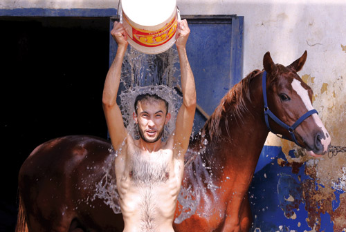 - في بيروت لم ير هذا اللبناني بدّاً من غسل نفسه بعد أن فعل ذلك مع حصانه لتخفيف آثار الحرارة العالية في الرابع من أغسطس