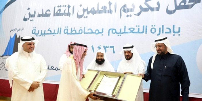 رعى محافظ البكيرية بالإنابة الأستاذ عبد الرحمن السعوي حفل تكريم المعلمين المتقاعدين بإدارة تعليم البكيرية، وبحضور مدير التعليم الأستاذ إبراهيم الشمسان ومساعديه للشؤون التعليمية الدكتور خالد الراجح وللشؤون المدرسية الأستاذ محمد القضيبي ونائب لجنة أهالي البكيرية الدكتور سليمان النملة وعدد من مديري الإدارات الحكومية بالمحافظة وأعضاء لجنة الأهالي ومنسوبي إدارة التعليم، وذلك بفندق رمادا بقاعة الشيخ محمد العلي السويلم الثقافية والذي تنظمه شعبة علاقات المعلمين وبرعاية من لجنة أهالي البكيرية.