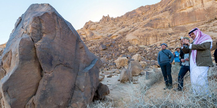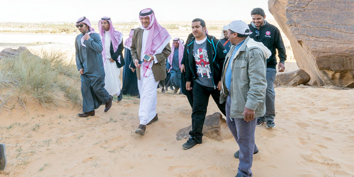 وأعرب سموه عن شكره وتقديره لصاحب السمو الملكي الأمير سعود بن عبدالمحسن أمير منطقة حائل رئيس مجلس التنمية السياحية بالمنطقة على ما تجده المشاريع السياحية ومشاريع العناية بالتراث الوطني من اهتمام كبير ومتابعة دائمة وإشراف مستمر، مؤكداً أن الزيارة تتم بالتنسيق مع سموه لمتابعة أعمال الاستكشافات الصخرية ولقاء فريق العمل الميداني والاستماع إليهم عن نتائج أعمالهم، كما قدم سموه الشكر لشركاء الهيئة في المنطقة من الأمانة والبلدية والجامعة على مثابرتهم وحرصهم على أن تكون هذه المواقع التاريخية مصانة ومحفوظة من العبث .