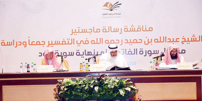 شهدت كلية التربية بالزلفي التابعة لجامعة المجمعة مناقشةً علميةً لأول رسالة ماجستير يتم تحكيمها في الجامعة تقدمت بها الطالبة سميه بنت عبدالله بن عبيد الموسى عن أقوال الشيخ عبدالله بن حميد - رحمه الله - في التفسير (جمعًا ودراسة) وتكونت لجنة المناقشة من: الأستاذ الدكتور سعود بن عبدالعزيز الحمد أستاذ التفسير في قسم الدراسات الإسلامية في الكلية مشرفًا ومقررًا ومعالي الشيخ الدكتور صالح بن عبدالله بن حميد المستشار في الديوان الملكي وإمام وخطيب المسجد الحرام مناقشًا خارجيًا والأستاذ الدكتور سليمان بن عبدالعزيز السليمان أستاذ التفسير في قسم الدراسات الإسلامية في الكلية مناقشًا داخليًا وقد استمرت المناقشة قرابة ثلاث ساعات خلت بعدها اللجنة للمداولة والحكم على الرسالة فأوصت بمنح الطالبة درجة الماجستير في القرآن وعلومه بتقدير ممتاز.