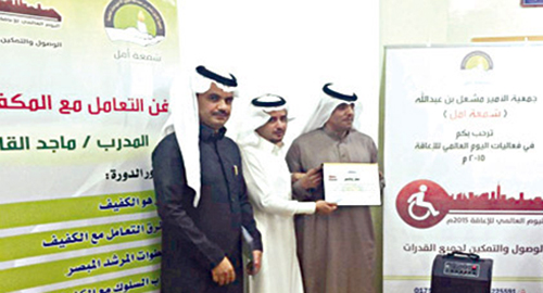 نظمت جمعية “شمعة أمل” دورة عن كيفية التعامل مع المكفوفين في أول برامجها بفعاليات اليوم العالمي للإعاقة 2015م حضرها عدد من المكفوفين والمبصرين للاستفادة من هذه الدورة وتناولت الدورة عددا من المحاور من أهمها من هو الكفيف وكيفية التعامل معه واستخدام العصى البيضاء وخطوات المرشد المبصر وآداب وسلوك التعامل مع الكفيف وتم عرض كل محوربشكل مفصل مع مقطع فيديو وتم تطبيق بعض الطرق للحضور عن كيفية التعامل لتعم الفائدة للجميع وفي نهاية الدورة شكر المدرب الحضور وقدم رئيس المجلس شكره للحضور والمدرب وتم تسليم شهادة شكر للحضور وأيضا تم تسجيل إهدائهم على لوحة الإهداءات بمناسبة هذه الفعاليات.