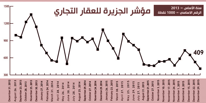 وبالنظر إلى مكونات المؤشر فقد سجلت أغلبها انخفاضًا ولكن الانخفاض الأكبر جاء من نصيب الأراضي التجارية التي انخفض فيها النشاط بنسبة 46 بالمائة أي أنها شكلت عامل الضغط الرئيس على حركة المؤشر وكذلك تراجعت الأراضي الزراعية التي تندرج تحت القطاع التجاري بنسبة 9 بالمائة وانخفض النشاط على في قطاع الشقق التجارية بنسبة 10 بالمائة، وبلغت قيمة متوسط مؤشر الجزيرة التجاري لآخر 3 أشهر 590 نقطة، وبذلك يكون الانخفاض في المؤشر منذ قرار الرسوم حوالي 40 بالمائة. وبالنظر إلى أداء المؤشر التجاري منذ بداية هذا العام 2015 فقد انخفض بنسبة 45.1 بالمائة، فيما بلغت نسبة الانخفاض في المؤشر التجاري من بداية التأسيس 49.1 بالمائة.
