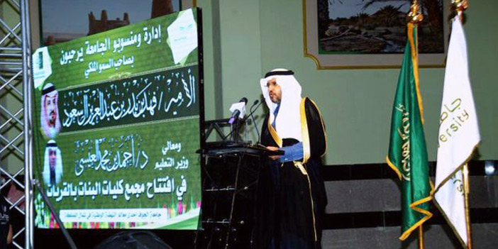 افتتح صاحب السمو الملكي الأمير فهد بن بدر بن عبد العزيز، أمير منطقة الجوف وبحضور معالي وزير التعليم الدكتور أحمد العيسى، ومعالي مدير جامعة الجوف الدكتور إسماعيل البشري، مباني مجمع كليات البنات بالقريات إحدى كليات جامعة الجوف. وفور وصول سموه لمقر الحفل كان في استقباله وزير التعليم ومدير الجامعة. ثم قص سموه شريط الافتتاح، بعدها تجول في أركان المبنى الذي اشتمل على القاعات الدراسية والمعامل والمختبرات والمكتبات المقروءة والسمعية، وقاعات مصادر التعلم والمسرح والاستوديوهات وقاعات التدريس عن بعد، وشاهد نموذجاً لأحد أجهزة الخدمات الذاتية التي تستعين بها الطالبات في الحصول على الاحتياجات الأكاديمية والخدمية. بعد ذلك حضر سموه الحفل الخطابي المعد بهذه المناسبة، الذي تضمن كلمة لمعالي مدير الجامعة الدكتور البشري، رحب من خلالها بأمير المنطقة، ووزير التعليم؛ مشيداً بجهود خادم الحرمين الشريفين في دعم مسيرة التعليم بالمملكة، وتقديم الدعم اللا محدود للجامعات لتبقى منارة تعليمية متميزة لإنتاج أجيال تقوم على سواعدهم مملكتنا الشامخة؛ مثمناً توجيهات ومتابعة أمير المنطقة في اكتمال عقد المباني الجامعية بكافة محافظات المنطقة، ليستفيد بذلك بناتنا وأبنائنا الطلاب والطالبات من معين علم قائم على أساس معرفة صحيحة، وتوفير كل ما من شأنه تقدم المستوى العلمي في قاعات دراسية مجهزة ومعامل ومختبرات، وتوفير أيضا المناخ المناسب للتعليم الجامعي. بعد ذلك ألقى الدكتور عطا الله العبار، كلمة أهالي القريات، أشار فيها لاحتياجات أبناء القريات من تخصصات مناسبة لسوق العمل وزيادة الكليات لتكون نواة لجامعة القريات، لتخفف عنهم المسافات الطويلة لكي يحصلوا على تخصص يناسب إمكانياتهم وطموحهم، والتخفيف من الحوادث المرورية التي أخذت كثيراً من شباب المحافظة، ثم قدم عرض مرئي عن جامعة الجوف. بعد ذلك تم تكريم الجهات الداعمة والمشاركة في مشروعي القريات وطبرجل، كما قدمت هدية تذكارية لوزير التعليم عبارة عن واجهة لجامعة الجوف، وهدية لسمو أمير المنطقة عبارة عن قصر الشعلان يتوسطه شعار الجامعة.