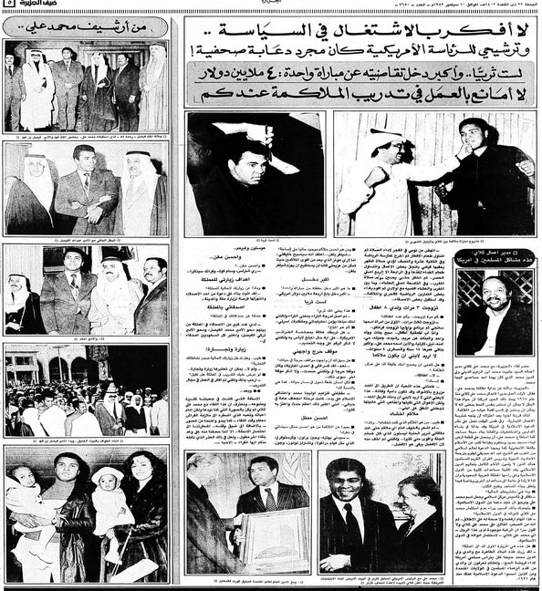 محمد علي كلاي.. الملاكم الأسطوري الغني عن التعريف استضافته (الجزيرة) عبر حوار مطول مع الزميل عبدالله الشهري في العدد (3650) بتاريخ 10 سبتمبر 1982م. تحدث كلاي في هذا الحوار عن أهم تفاصيل حياته وبعض القضايا التي كانت بارزة على السطح حينها، كما عرج إلى زيارته الأولى للمملكة عام 1974 والتي التقى خلالها بالملك فيصل بن عبدالعزيز، مبدياً إعجابه وتأثره الشديد بالفيصل، وقال: "الملك فيصل -رحمه الله- كان رجلاً متواضعاً وكريماً وطيباً جداً معي في ذلك اللقاء الذي لن أنساه"، وأضاف: "لقد زرت أقطاراً كثيرة، ولكنني لم أقابل مثل الملك فيصل. لقد كان رجلاً عظيماً بكل ما تعنيه الكلمة من معنى، ولقد لمست منه اهتماماً شديداً بأحوال المسلمين في أمريكا وأوضاعهم، ورغبة صادقة لنشر الدين الإسلامي وإحلال السلام العالمي.. لن أنسى هذا اللقاء".