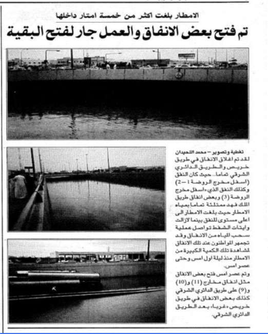 تسببت الأمطار التي هطلت في اليومين الماضيين على العاصمة الرياض في إغلاق بعض الأنفاق والتقاطعات الواقعة على الطريق الدائري، وخصوصاً نفق طريق خريص أسفل مخرج الروضة، حيث بلغ حجم الأمطار داخل الأنفاق أعلى مستوى له تجاوز خمسة أمتار. كما تضررت بعض الطرق الرئيسية في حيي العليا والروضة من غزارة الأمطار؛ مما دعا إلى إغلاقها وقتاً طويلاً من أجل شفط تجمعات المياه.