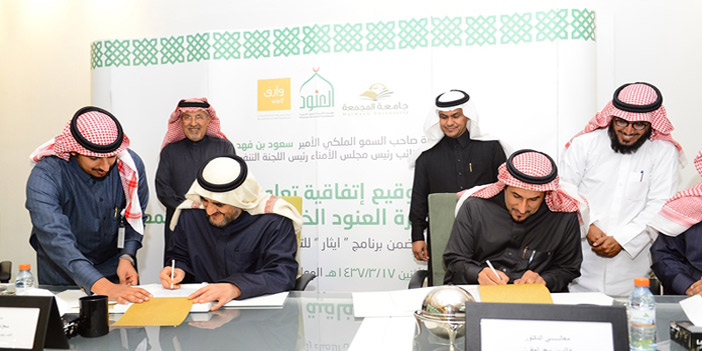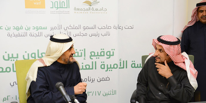 برعاية من صاحب السمو الملكي الأمير سعود بن فهد بن عبد العزيز آل سعود نائب رئيس مجلس الأمناء رئيس اللجنة التنفيذية لمؤسسة الأميرة العنود الخيرية تم توقيع اتفاقية تعاون بين جامعة المجمعة ومؤسسة الأميرة العنود الخيرية, ومثَّل الجامعة مديرها الدكتور خالد بن سعد المقرن، وتأتي هذه الخطوة ضمن سلسلة من الاتفاقيات مع الجمعيات والمؤسسات العامة العاملة في المجال الخيري, وتحقيقاً لمبادئ المسؤولية الاجتماعية للجامعة، وتهدف للتعاون بين الجامعة والمؤسسة في مجال شؤون الشباب, وتفعيل العمل التطوعي، وتنفيذ برامج تطوير وتنمية المهارات الحياتية بما يساهم في بناء قدرات الشباب، ونشر ثقافة العمل التطوعي، و تنص بنود الاتفاقية على تشكيل فريق عمل مشترك لتفعيل كافة بنودها, وتحديد أُطر العمل المستقبلي بما يحقق أهدافها، وكان في استقبال مدير الجامعة عند وصوله مقر المؤسسة منسوبو المؤسسة الخيرية, وعلى رأسهم الدكتور يوسف بن عثمان الحزيم، حيث قدَّم شرحاً تفصيلياً عن أنشطة وبرامج المؤسسة, كما استعرض وصية الأميرة العنود, التي تعدُّ منهجاً لعمل المؤسسة في مجال العمل الخيري. وكان صاحب السمو الملكي الأمير سعود بن فهد بن عبدالعزيز قد شرّف مراسم التوقيع, وأشاد بجهود الجامعة ودورها المجتمعي الفاعل بعد أن أطلعه مدير الجامعة على بعض مناشط الجامعة، والإحصاءات المتعلقة بالطلاب وأعضاء هيئة التدريس والطاقم الإداري العامل بالجامعة, ثم استمع الجميع لتوجيهات سموه ونصائحه في مجال العمل الخيري, وقدّم مدير الجامعة شكره لسموه على رعايته الكريمة.