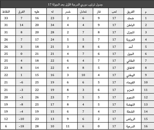 بعد مرور 17 جولة من أحداث دوري الدرجة الأولى دخلت المنافسة على المراكز الأولى تنافسًا محمومًا بين ثلاثي المقدمة (ضمك والباطن والمجزل) في صراع مثير سيمتد في الجولات القادمة للتعرف على هوية المتنافسين على الصعود، فيما بدأت الأمور في المراكز الأخرى من الرابع وحتى الرابع عشر شبه غامضة للتنافس الكبير والتقارب النقطي المثير حيث لا يبتعد الرابع عن الرابع عشر سوى بسبع نقاط وربما تشهد الجولة المقبلة تغيرات كبيرة في المراكز، على عكس المؤخرة التي باتت أمورها شبه محسومة لفريق الدرعية الذي أصبح الأقرب لتوديع الدوري مع الرياض الذي ما زال يصارع من أجل البقاء، ويمر الدوري هذه الأيام بفترة توقف لمدة أسبوعين قد تسهم كثيرًا في إصلاح الخلل لدى الكثير من الأندية التي ستستغل فترة التوقف في معالجة الأخطاء، وكانت نتائج الجولة الماضية قد جاءت على النحو التالي:
