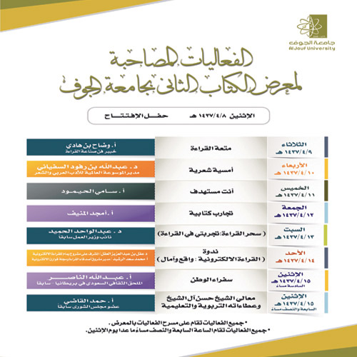 يدشن صاحب السمو الملكي الأمير فهد بن بدر بن عبد العزيز أمير منطقة الجوف - حفظه الله- اليوم الاثنين، النسخة الثانية من معرض الكتاب بالجامعة، الذي تمتد فعالياته على مدار عشرة أيام، في صالة المعارض التابعة للغرفة التجارية، شمال مدينة سكاكا.