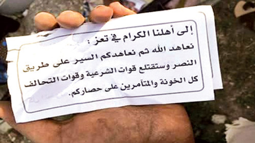 وأفاد شهود عيان أن المنشورات الورقية التى سقطت في العديد من الأحياء وسط المدينة، كتبت عليها عبارات (إلى أهلنا الكرام في تعز، نعاهد الله ومن ثم نعاهدكم السير على طريق النصر وستقتلع قوات الشرعية وقوات التحالف كل الخونة والمتآمرين على حصاركم).