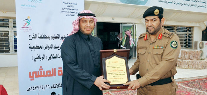 أطلقت إدارة التعليم بمحافظة الخرج امس برنامجا اجتماعيا بعنوان « المشي رياضة « بمشاركة فاعلة من قيادات الإدارات الأمنية وممثلين عن الجهات الحكومية والقطاع الخاص، ومشاركة أكثر من 500 طالِب يمثلون 40 مدرسة.