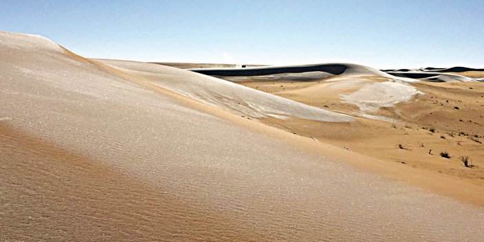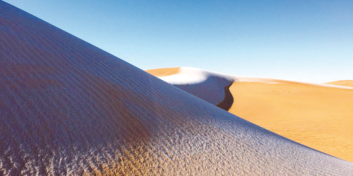 تجمّدت الرمال ولم تستطع أشعة الشمس الساطعة أن تذيب الصقيع من على رمال النفود في تربة الواقعة شمال المملكة وتبعد عن حايل بمسافة 150كم شمالاً الكثبان الرملية والذي تجمّدت نتيجة تدني درجة الحرارة فجر الجمعة واستمر تجمّدها إلى ساعات الظهيرة مع درجة حرارة ارتفعت من خمس درجات تحت الصفر فجراً إلى درجتين تحت الصفر قبيل ساعات الظهيرة رسمت لوحات نادرة باللون الأبيض بخلفية عروق النفود المتموجة وأتاحت الفرصة للتزلج وسهولة المشي والحركة في تلك الكثبان الرملية.. عدسة (الجزيرة) رصدت تجمّد الرمال في شمال المملكة.