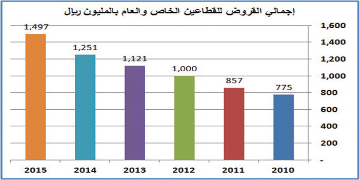 إلا أنَّ إعلان مؤسسة النقد العربي السعودي أظهر ما يخالف ذلك، حيث بيَّن في نشرته الشهرية الأخيرة أنَّ إجمالي القروض التي منحتها البنوك للقطاعين الحكومي والخاص بلغت في نهاية عام 2015م حوالي 1497 مليار ريال، وذلك مقارنة بقيمة 1251 مليار ريال في نهاية عام 2014م، أي أنَّ الإجمالي العام لقروض الجهاز المصرفي ارتفع بنسبة 19.7% خلال العام المنتهي 2015م .. وهو ما يعطي دلالات على أنَّ الجهاز المصرفي سعى لتغطية العجز في السيولة؛ نتيجة تقييد الإنفاق الحكومي .. ولكن كيف جاءت هذه القروض وتوزيعاتها؟