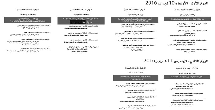 وجاء في بيان المنظمين أنَّ هناك ورش عمل مهمة ستعقد بمصاحبة المعرض يتحدث فيها كبار مسؤولي وزارة الإسكان، وبرنامج بيع الوحدات العقارية على الخارطة، إضافة إلى قيادات شركات القطاع العقاري والإسكاني والتمويلي، وستكون وفق البرنامج التالي: