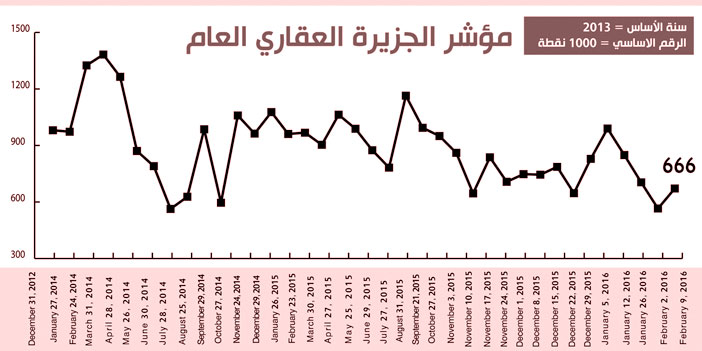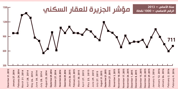 سجل مؤشر الجزيرة للعقار السكني انخفاضاً بنسبة 3.1 % في تداولات الأسبوع الماضي ليغلق عند مستوى 711 نقطة، مقارنة بإغلاق 733 نقطة للأسبوع قبل الماضي، أي بانخفاض قدره 22 نقطة. وبالنظر إلى مكونات المؤشر، فقد سجل النشاط انخفاضاً في أكبر ثلاث قطاعات وزن في المؤشر على النحو التالي: قطاع الأراضي السكنية انخفض بنسبة 2.8 %، وانخفض قطاع الشقق السكنية بنسبة 7.8 %، وكذلك انخفض النشاط في قطاع الأراضي الزراعية بنسبة 7.8 %، وجاء قطاع الفلل الأكثر انخفاضاً بنسبة 52 %، في المقابل ارتفع النشاط على قطاع البيوت بنسبة 33 % وسجلت بقية القطاعات انخفاضاً أو ثباتاً، مقارنة بالأسبوع قبل الماضي. وقد بلغت قيمة متوسط مؤشر الجزيرة السكني لآخر 3 أشهر 726 نقطة، أي أن القيمة الحالية للمؤشر أقل من هذا المتوسط بنحو 2 % ولا يزال يشهد هذا المتوسط المزيد من الانخفاض نتيجة التراجع المستمر في قيمة المؤشر. وبالنسبة لأداء المؤشر خلال عام 2016 فقد سجل ارتفاعاً بنسبة 4.8 %، أما التغير في المؤشر منذ سنة التأسيس فقد انخفض بنسبة 28.9 %.