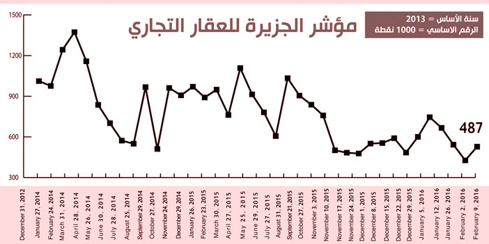 سجل مؤشر الجزيرة للعقار التجاري تراجعاً للأسبوع الثاني على التوالي حيث انخفض في تداولات الأسبوع الماضي بنسبة 4.6 % ليغلق عند مستوى 487 نقطة، مقارنة بإغلاق 511 نقطة للأسبوع قبل الماضي. وبالنظر إلى مكونات المؤشر، فقد سجلت أغلبها تراجعاً في النشاط حيث انخفض قطاع الأراضي التجارية بنسبة 4.6 %، وفي المقابل سجل قطاعي الشقق التجارية وكذلك الأراضي الزراعية التي تقع تحت القطاع التجاري ارتفاعاً بنسبة 17 و13 % على التوالي، وهذان القطاعان يشكلان نحو 27 % من وزن المؤشر، فيما جاء الأكثر انخفاضاً في قطاع البيوت بنسبة 60 %. وبلغت قيمة متوسط المؤشر لآخر 3 أشهر 533 نقطة منخفضة عن مستواه السابق بـ 11 نقطة، وهذا يعني أن القيمة الحالية أقل بنسبة 9 %، أي أن المؤشر لم يستطع أن يحافظ على قيمة أعلى من هذا المتوسط أكثر من أسبوعين متتاليين, وهو ما نوهنا عنه في تقرير الأسبوع الماضي بأن الإشارة الإيجابية هي أن يحافظ المؤشر على قيمة أعلى من المتوسط لعدة أسابيع متتالية وهو مالم يفعله. وبالنسبة للتغير في قيمة المؤشر خلال 2016 فقد انخفض بنسبة 12.3 %، أما التغير في المؤشر التجاري من سنة التأسيس (2013) فقد انخفض بنسبة 51.3 %.
