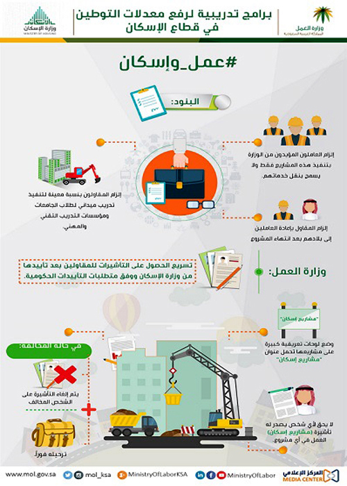 تشرع وزارة العمل، وفقاً لمذكرة التعاون المبرمة مع وزارة الإسكان «عمل وإسكان»، في تقديم برامج تدريبية عبر المؤسسة العامة للتدريب التقني والمهني وبدعم وتمويل من صندوق تنمية الموارد البشرية «هدف»، لرفع معدلات التوطين وتوفير الفرص الوظيفية للباحثين والباحثات عن عمل في مشاريع قطاع الإسكان. وطبقاً لبنود الاتفاقية المبرمة بين الوزارتين، تلتزم كل منشأة يتم التعاقد معها من قبل وزارة الإسكان لمشروع تطوير مبانٍ سكنية ضمن مشاريع إسكان المواطنين، بفتح فرع لها يصنف في وزارة العمل تحت مسمى «مشاريع الإسكان»، فيما تنشئ وزارة العمل نشاط جديد تحت مسمى «مشاريع الإسكان»، تصنف فيه فروع المنشآت التي أنشئت لهذا الغرض، إذ تحدد وزارة العمل على ضوء ذلك نسبة التوطين المطلوبة لهذا النشاط. واستكمالاً لبنود الاتفاقية، يمتد التعاون بين الوزارتين إلى إلزام المقاولين بنسبة معينة لتنفيذ تدريب ميداني لطلاب الجامعات ومؤسسات التدريب التقني والمهنـي في التخصصات التي تناسب نشاط المنشأة. وتأتي مذكرة التعاون التي يمتد تنفيذها لمدة 5 سنوات قادمة انطلاقاً من أهمية التشاركية بين مختلف القطاعات والأجهزة الحكومية، تنفيذاً لاستراتيجية دعم مشاريع الإسكان بالقوى الوطنية في جميع مناطق المملكة ومحافظاتها ومراكزها، إضافة إلى تيسير وتسريع الإجراءات والأعمال بين أطراف الاتفاقية.