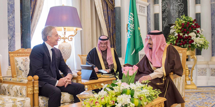 استقبل خادم الحرمين الشريفين الملك سلمان بن عبدالعزيز آل سعود - حفظه الله - في مكتبه بقصر اليمامة أمس، دولة رئيس وزراء بريطانيا الأسبق توني بلير.