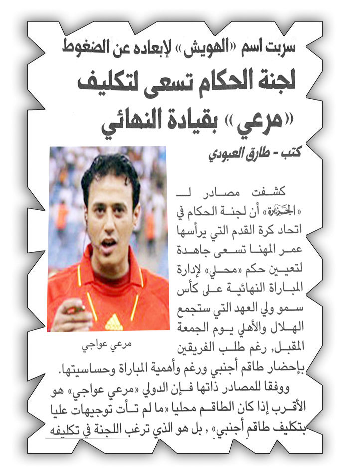 تجدر الإشارة إلى أن «الجزيرة» تميزت في عدد الأحد الماضي بتوجه لجنة الحكام وسعيها لتكليف طاقم محلي بقيادة مرعي عواجي, في الوقت الذي راجت فيه أنباء متواترة عن حضور طاقم أجنبي.