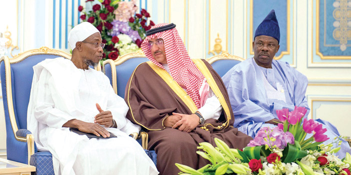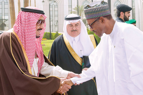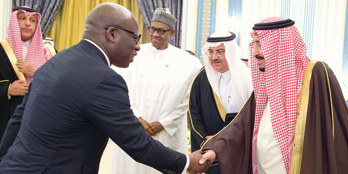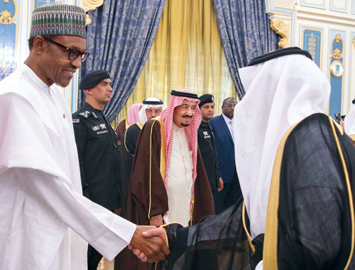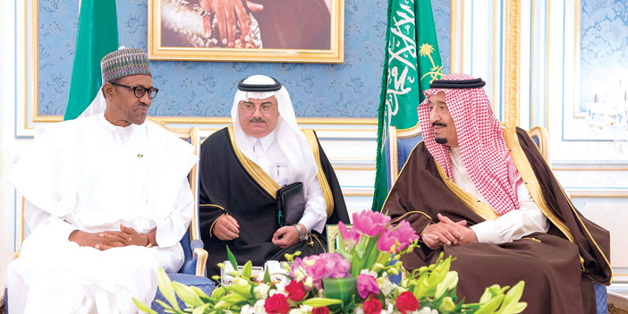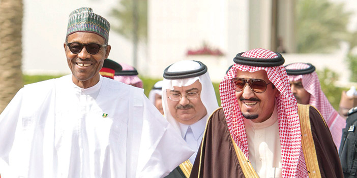 وكان خادم الحرمين الشريفين الملك سلمان بن عبدالعزيز آل سعود -حفظه الله- قد استقبل في قصر اليمامة أمس، فخامة الرئيس محمد بخاري رئيس جمهورية نيجيريا. كما كان في استقبال فخامته، صاحب السمو الملكي الأمير فيصل بن بندر بن عبدالعزيز أمير منطقة الرياض، وصاحب السمو الملكي الأمير محمد بن نايف بن عبدالعزيز ولي العهد نائب رئيس مجلس الوزراء وزير الداخلية. وقد أجريت لفخامة الرئيس النيجيري، مراسم استقبال رسمية، حيث عزف السلامان الوطنيان للبلدين، ثم استعرض حرس الشرف. بعد ذلك صافح فخامته مستقبليه، صاحب السمو الملكي الأمير الدكتور منصور بن متعب بن عبدالعزيز وزير الدولة عضو مجلس الوزراء مستشار خادم الحرمين الشريفين، وصاحب السمو الملكي الأمير متعب بن عبدالله بن عبدالعزيز وزير الحرس الوطني، وصاحب السمو الملكي الأمير عبدالعزيز بن سلمان بن عبدالعزيز نائب وزير البترول والثروة المعدنية، وصاحب السمو الملكي الأمير الدكتور عبدالعزيز بن سطام بن عبدالعزيز مستشار خادم الحرمين الشريفين، وصاحب السمو الملكي الأمير منصور بن مقرن بن عبدالعزيز مستشار خادم الحرمين الشريفين، وأصحاب المعالي الوزراء، وقادة القطاعات العسكرية. كما صافح خادم الحرمين الشريفين -أيده الله- الوفد الرسمي المرافق لفخامة الرئيس النيجيري. عقب ذلك صحب خادم الحرمين الشريفين الملك سلمان بن عبدالعزيز آل سعود، فخامة الرئيس محمد بخاري رئيس جمهورية نيجيريا، إلى صالة الاستقبال الرئيسية بالديوان الملكي، حيث صافح فخامته أصحاب السمو الأمراء، وأصحاب المعالي، وكبار المسؤولين. وقد أقام خادم الحرمين الشريفين مأدبة غداء تكريماً لفخامة رئيس جمهورية نيجيريا، والوفد المرافق له. حضر الاستقبال ومأدبة الغداء، صاحب السمو الأمير بندر بن محمد بن عبدالرحمن، وصاحب السمو الملكي الأمير تركي الفيصل بن عبدالعزيز، وصاحب السمو الملكي الأمير مشعل بن سعود بن عبدالعزيز، وصاحب السمو الأمير عبدالعزيز بن فهد بن فيصل، وصاحب السمو الملكي الأمير سعود بن سعد بن عبدالعزيز، وصاحب السمو الملكي الأمير محمد بن فهد بن عبدالعزيز، وصاحب السمو الملكي الأمير تركي بن ناصر بن عبدالعزيز، وصاحب السمو الملكي الأمير خالد بن سعد بن عبدالعزيز، وصاحب السمو الملكي الأمير نايف بن سعود بن عبدالعزيز، وصاحب السمو الأمير الدكتور تركي بن محمد بن سعود الكبير وكيل وزارة الخارجية للعلاقات متعددة الأطرافوصاحب السمو الأمير متعب بن ثنيان بن محمد، وصاحب السمو الأمير الدكتور عبدالرحمن بن سعود الكبير، وصاحب السمو الأمير سعود بن عبدالله بن ثنيان رئيس الهيئة الملكية للجبيل وينبع، وصاحب السمو الملكي الأمير الوليد بن طلال بن عبدالعزيز، وصاحب السمو الملكي الأمير نواف بن عبدالله بن سعود، وصاحب السمو الأمير عبدالعزيز بن فهد بن سعد، وصاحب السمو الأمير فيصل بن سعود بن محمد، وصاحب السمو الأمير الدكتور سعود بن سلمان بن محمد، وصاحب السمو الأمير عبدالعزيز بن سلمان بن محمد، وصاحب السمو الأمير الدكتور محمد بن سلمان بن محمد، وصاحب السمو الملكي الأمير يوسف بن سعود بن عبدالعزيز، وصاحب السمو الأمير خالد بن سعد بن خالد، وصاحب السمو الأمير أحمد بن عبدالله بن عبدالرحمن محافظ الدرعية، وصاحب السمو الأمير بندر بن سعود بن محمد رئيس الهيئة السعودية للحياة الفطرية، وصاحب السمو الأمير محمد بن سعود بن خالد وكيل وزارة الخارجية لتقنية المعلومات، وصاحب السمو الأمير سعد بن عبدالله بن مساعد، وصاحب السمو الأمير الدكتور بندر بن سلمان بن محمد، وصاحب السمو الأمير منصور بن ثنيان بن محمد، وصاحب السمو الملكي الأمير محمد بن فيصل بن بندر بن عبدالعزيز، وصاحب السمو الملكي الأمير فيصل بن خالد بن سلطان بن عبدالعزيز المستشار بالديوان الملكي، وصاحب السمو الملكي الأمير تركي بن محمد بن فهد بن عبدالعزيز، وصاحب السمو الملكي الأمير محمد بن عبدالرحمن بن عبدالعزيز، وصاحب السمو الأمير فيصل بن محمد بن سعد وكيل إمارة من