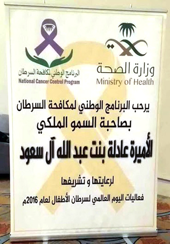 أكدت صاحبة السمو الملكي الأميرة عادلة بنت عبد الله آل سعود أن التثقيف الصحي من الأهداف التي ننشدها جميعاً سواء وزارة الصحة أو مؤسسات المجتمع المدني، كما أنّ مشاركة المؤسسات الحكومية والأهلية في تحمّلِ المسؤولية الوطنية حول مكافحة مرض السرطان بكافّةِ أنواعِه من أهمّ الإستراتيجياتِ التي تحشد لها كافّةَ الجهودِ للتغلّبِ عليه ومكافحتِه ومؤازرةِ المتأثرين به.