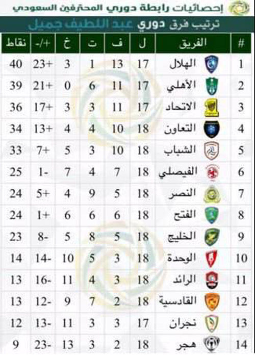 تواصلت أمس مباريات الجولة الـ18 من الدوري السعودي، حيث تعادل في الرياض الوحدة مع مضيفه النصر بهدف لمثله، في حين حقق فريق الرائد فوزاً هاماً على ضيفه القادسية قوامه هدفين لهدف، وكسب الفيصلي مضيفه هجر بهدف دون رد.