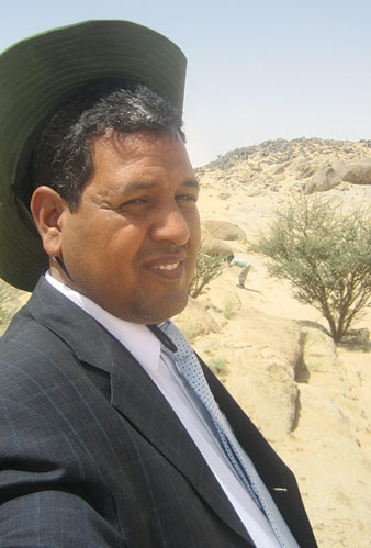 - من أنتم؟ « ومين اللي جابكم هنيّه» سأل راكب السيارة الجيب بصوت عال، وكان شعره طويلا ويحمل في كتفه سلاحًا رشّاشاً، وقد نزل إليه الدكتور عيد اليحيى ليجيبه ولم أنزل من الكرافان ولم أترجل وراقب بقية الرفاق المسألة من بعيد. فأجابه د. اليحيى عن تساؤلاته وأننا فريق بحثي في رحلة علمية تابعة لمركز الملك فيصل للبحوث والدراسات الإسلامية، وأراه صورة الخطاب الصادر من المركز لقيامنا بالرحلة.