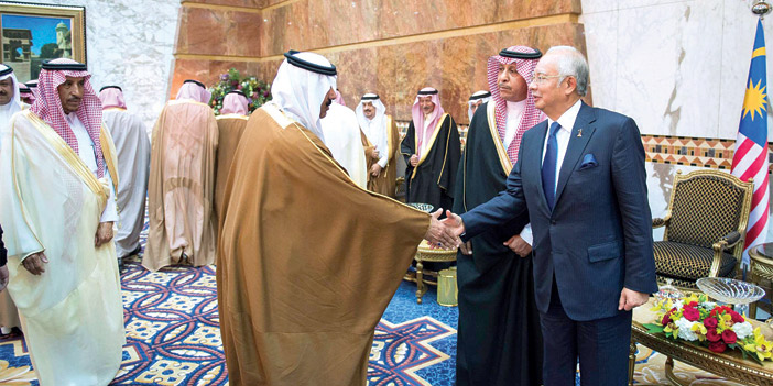 وكان خادم الحرمين الشريفين الملك سلمان بن عبدالعزيز آل سعود - حفظه الله - قد استقبل في قصره بالرياض أمس دولة رئيس وزراء ماليزيا محمد نجيب عبدالرزاق والوفد المرافق له. وفي بداية الاستقبال صافح رئيس وزراء ماليزيا أصحاب السمو الأمراء وأصحاب المعالي وكبار المسؤولين وقد أقام خادم الحرمين الشريفين مأدبة غداء تكريما له ومرافقيه. حضر الاستقبال والمأدبة صاحب السمو الأمير عبدالعزيز بن فهد بن فيصل وصاحب السمو الملكي الأمير محمد بن سعد بن عبدالعزيز وصاحب السمو الملكي الأمير فيصل بن بندر بن عبدالعزيز أمير منطقة الرياض وصاحب السمو الملكي الأمير سعود بن سعد بن عبدالعزيز وصاحب السمو الملكي الأمير خالد بن سعد بن عبدالعزيز وصاحب السمو الأمير الدكتور تركي بن محمد بن سعود الكبير وكيل وزارة الخارجية للعلاقات متعددة الأطراف، وصاحب السمو الأمير متعب بن ثنيان بن محمد وصاحب السمو الأمير الدكتور عبدالرحمن بن سعود الكبير وصاحب السمو الملكي الأمير خالد بن بندر بن عبدالعزيز مستشار خادم الحرمين الشريفين وصاحب السمو الملكي الأمير الدكتور منصور بن متعب بن عبدالعزيز وزير الدولة عضو مجلس الوزراء مستشار خادم الحرمين الشريفين وصاحب السمو الملكي الأمير متعب بن عبدالله بن عبدالعزيز وزير الحرس الوطني وصاحب السمو الأمير سعود بن عبدالله بن ثنيان رئيس الهيئة الملكية للجبيل وينبع وصاحب السمو الملكي الأمير سطام بن سعود بن عبدالعزيز وصاحب السمو الملكي الأمير الوليد بن طلال بن عبدالعزيز وصاحب السمو الملكي الأمير نواف بن عبدالله بن سعود وصاحب السمو الأمير عبدالعزيز بن فهد بن سعد وصاحب السمو الأمير الدكتور سعود بن سلمان بن محمد وصاحب السمو الأمير الدكتور تركي بن سعود بن محمد رئيس مدينة الملك عبدالعزيز للعلوم والتقنية وصاحب السمو الأمير محمد بن سلمان بن محمد وصاحب السمو الأمير بندر بن سعود بن محمد رئيس الهيئة السعودية للحياة الفطرية، وصاحب السمو الأمير محمد بن سعود بن خالد وكيل وزارة الخارجية لتقنية المعلومات، وصاحب السمو الأمير الدكتور بندر بن سلمان بن محمد وصاحب السمو الأمير منصور بن ثنيان بن محمد وصاحب السمو الملكي الأمير محمد بن فيصل بن بندر وصاحب السمو الأمير سعد بن فيصل بن سعد وصاحب السمو الملكي الأمير فيصل بن خالد بن سلطان المستشار بالديوان الملكي وصاحب السمو الملكي الأمير سلمان بن سلطان بن عبدالعزيز وصاحبالسمو الملكي الأمير محمد بن عبدالرحمن بن عبدالعزيز وصاحب السمو الملكي الأمير أحمد بن فهد بن سلمان وصاحب السمو الملكي الأمير فهد بن نايف بن عبدالعزيز.