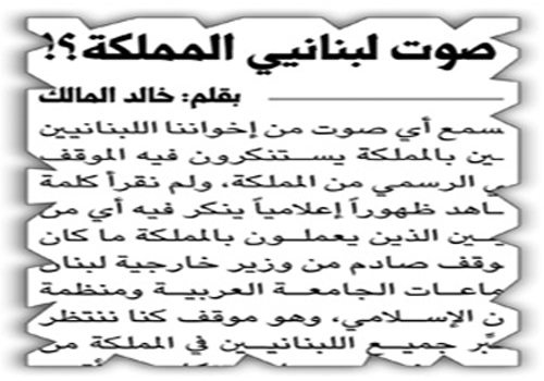 كتب رئيس التحرير/ خالد بن حمد المالك في الغراء صحيفة الجزيرة يوم الأربعاء 24 فبراير 2. 16م مقالا بعنوان (أين صوت لبنانيي المملكة).