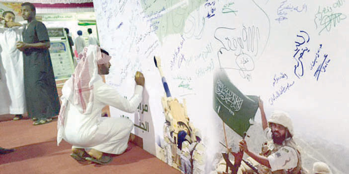 وتزاحم زوار جمعية رعاية الأيتام - رفاق الخيرية على «لوحة شارك بكلمة لأبطال الحد الجنوبي» بكلمات المشاعر الوطنية تجاه جنود الوطن البواسل في الحد الجنوبي وذلك بالفعاليات المصاحبة برالي حائل نيسان الدولي 2016م.