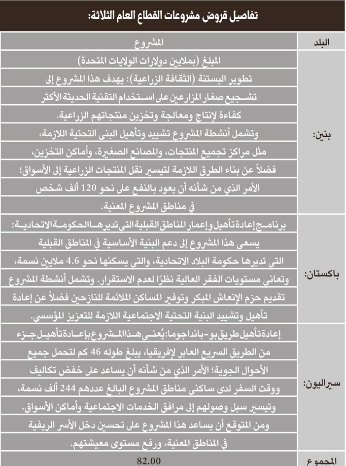 وفي معرض تعليقه بشأن هذه الدفعة الجديدة من التمويلات أوضح الحربش، أنه قد تم تخصيص 85 مليون دولار لدعم ثلاثة مشروعات حيوية للقطاع العام في كل من بنين وباكستان وسيراليون، وتشمل قطاع الزراعة والإسكان والتنمية العمرانية والنقل.
