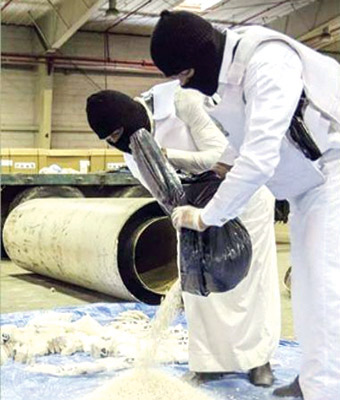 وأضاف أنه بتكثيف التحريات الأمنية عن الشاحنة الثانية تم بعون الله تحديد موقعها بمدينة الرياض ومداهمة المتورطين في جريمة التهريب خلال عملية تسليم المواد المخدرة لمستقبليها، وبتفتيش الشاحنة تم ضبط (2.426.800) مليونين وأربعمائة وستة وعشرون ألفاً وثمانمائة قرص إمفيتامين مخبأة داخل تجاويف مصنعية في آلات غسيل وتغليف تمور، وقد تم القبض على المتورطين في تهريب المواد المخدرة أحدهما يمني الجنسية والآخر يحمل الجنسية التركية، كما تم القبض على مستقبلي المواد المهربة وعددهم (3) ثلاثة سعوديين.