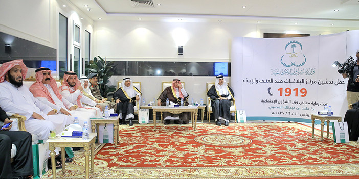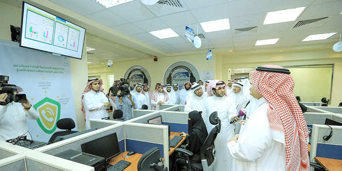دشن وزير الشؤون الاجتماعية الدكتور ماجد بن عبدالله القصبي مركز بلاغات العنف والإيذاء الذي يستقبل بلاغات العنف والإيذاء الأسري على مدار الساعة طيلة أيام الأسبوع بكوادر نسائية متخصصة بحضور رئيس هيئة حقوق الإنسان معالي الدكتور بندر العيبان والدكتور ناصر الشهراني نائب رئيس هيئة حقوق الإنسان واللواء الركن عبدالرحمن الصالح قائد المركز الوطني للعمليات الأمنية والدكتورة حمدة العنزي عضو مجلس الشورى والدكتورة مها المنيف المدير التنفيذي لبرنامج الأمان الأسري وعدد من ممثلي الجهات الحكومية الشريكة في الحماية الاجتماعية.