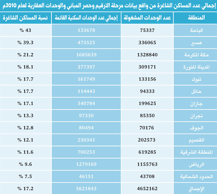 وكشفت بيانات مرحلة ترقيم وحصر المباني والوحدات العقارية التي نشرتها مؤخراً مصلحة الإحصاءات العامة والمعلومات على موقعها أن إجمالي عدد الوحدات غير المشغولة (الشاغرة) بلغ 969.7 ألف وحدة سكنية تمثل نحو 17.2% من إجمالي عدد السكان القائمة في المملكة البالغة نحو 5 ملايين و(622) ألف مسكن حتى نهاية 2010م.